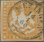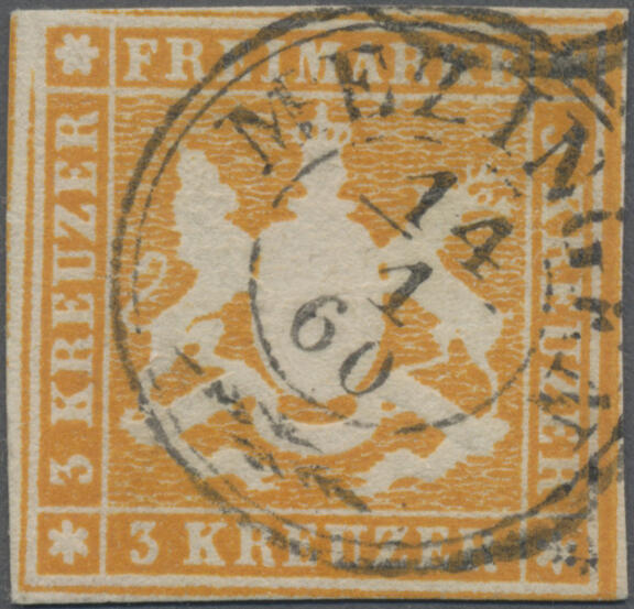 | Zusatzinformationen und Suchstichworte: | Christoph Gärtner 55. Auktion 20. - 24. Februar 2023 Los 5229 D Altdeutschland Württemberg 1857, 3 Kr. orange mit Abart "ohne Seidenfaden", farbtiefes und allseits gut gerandetes Exemplar mit üblichem, leicht berührendem Schnitt vom rechten Bogenrand, klar gestempelt mit Dkr. "MEZINGEN 14/1 60". Fotobefund Irtenkauf BPP Ausruf 250,00 EUR |