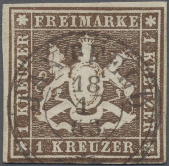 | Zusatzinformationen und Suchstichworte: | Christoph Gärtner 55. Auktion 20. - 24. Februar 2023 Los 5235 D Altdeutschland Württemberg 1859, 1 Kr. dunkelbraun, farbtiefes Exemplar, unten minimal berührend, sonst allseits voll- bis breitrandig geschnitten, klar und zentrisch entwertet mit Dkr. "JAXTFELD 18/1 63". Signiert Stolow sowie Fotobefund Heinrich BPP. Mi. 800,- €+ Ausruf 200,00 EUR |