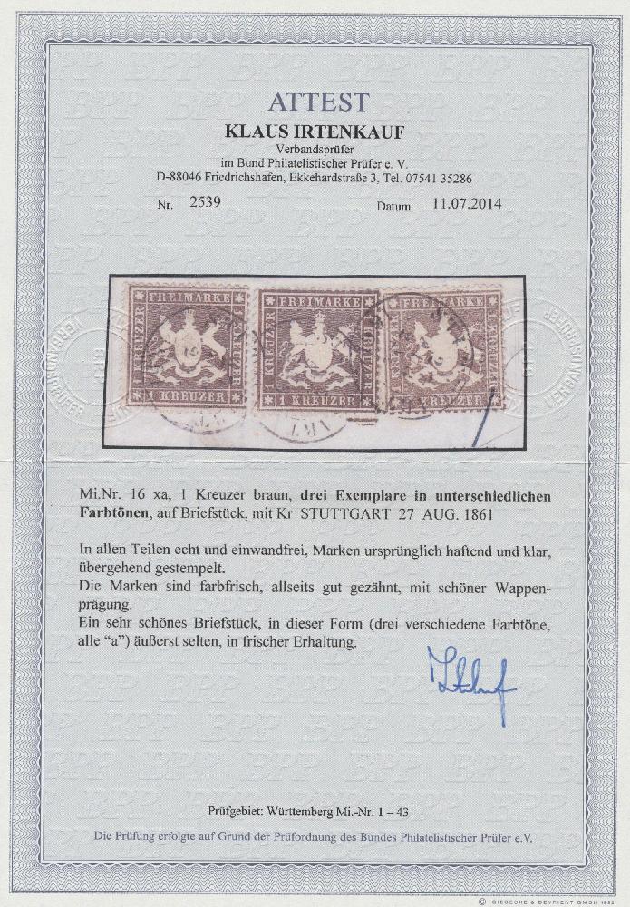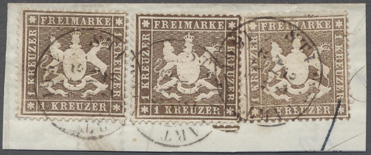 | Zusatzinformationen und Suchstichworte: | Christoph Gärtner 55. Auktion 20. - 24. Februar 2023 Los 5242 D Altdeutschland Württemberg 1861, Wappen, gezähnt 13 1/2, 1 Kreuzer braun, drei Exemplaren in drei unterschiedlichen Farbtönen der Unternummer "a" auf Briefstück, jede Marke entwertet "Stuttgart / 27 AUG. 1861". Auch laut Fotoattest Irtenkauf (2014) jede Marke farbfrisch, allseits gut gezähnt mit schöner Wappenprägung. Ein sehr schönes und in dieser Art sicher sehr seltenes Briefstück Ausruf 500,00 EUR |