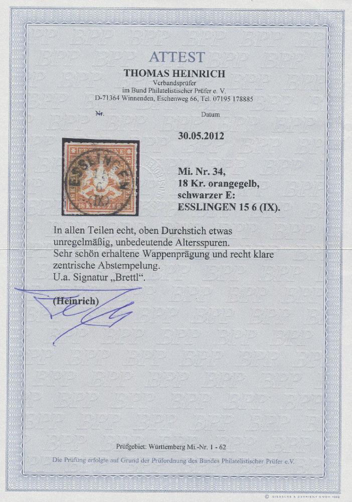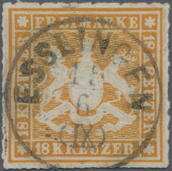 | Zusatzinformationen und Suchstichworte: | Christoph Gärtner 55. Auktion 20. - 24. Februar 2023 Los 5256 D Altdeutschland Württemberg 1865, 18 Kr. orangegelb, zentrisch entwertet "ESSLINGEN 15 6 (IX)", Durchstich oben minim unregelmäßig und leichte Altersspuren (beides unaufdringlich und u.E. belanglos). Mehrfach signiert, u.a. Brettl. Fotoattest Heinrich BPP Ausruf 250,00 EUR |