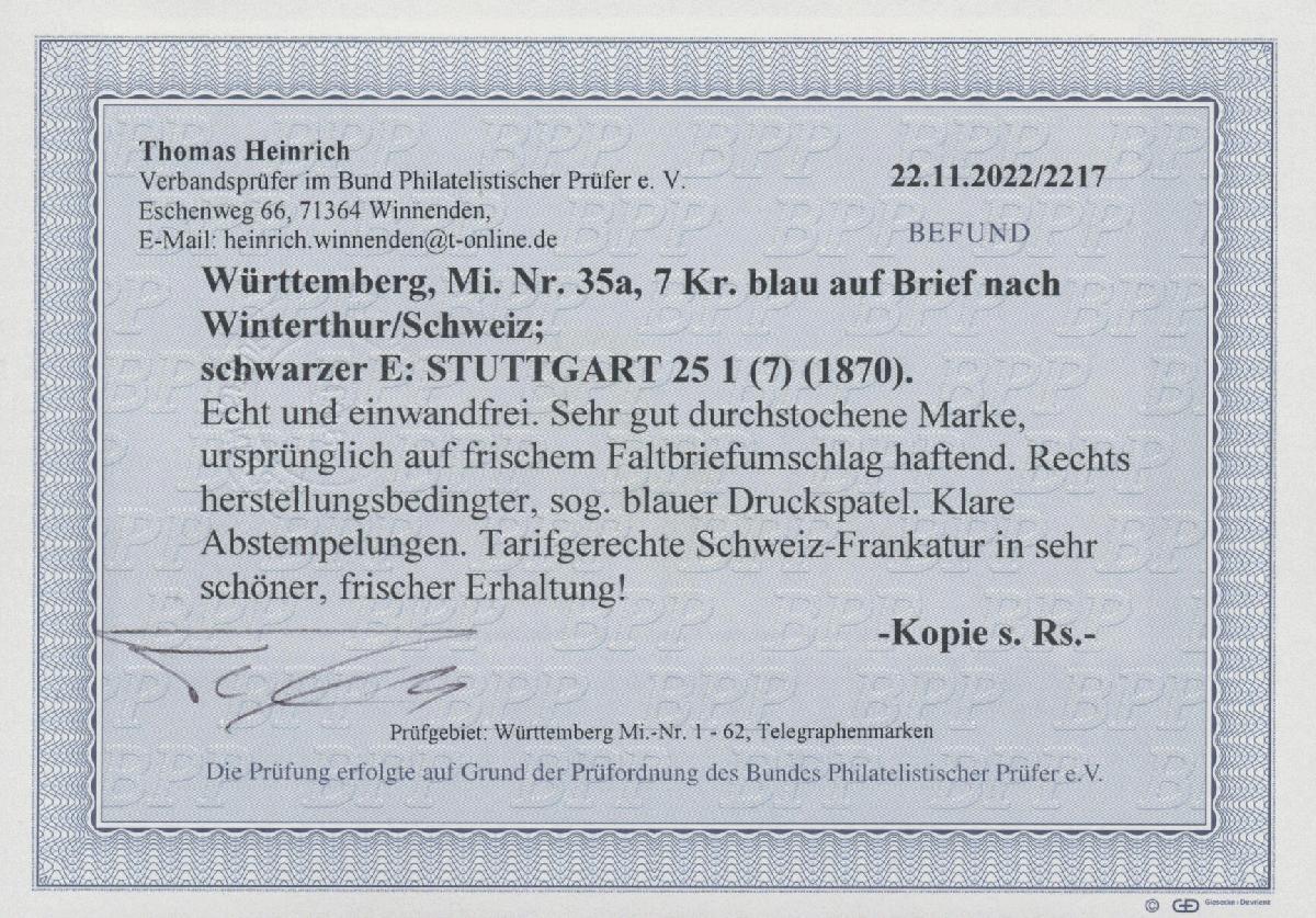 | Zusatzinformationen und Suchstichworte: | Christoph Gärtner 55. Auktion 20. - 24. Februar 2023 Los 5257 D Altdeutschland Württemberg 1870, 7 Kr. blau, farbfrischer Wert in sehr gutem Durchstich als tarifgerechte Einzelfrankatur auf Faltbriefhülle von "STUTTGART 25/1" nach Winterthur mit rs. Ankunftsstempel vom nächsten Tag. Fotobefund Heinrich BPP Ausruf 200,00 EUR |