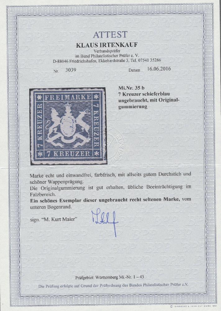| Zusatzinformationen und Suchstichworte: | Christoph Gärtner 55. Auktion 20. - 24. Februar 2023 Los 5258 D Altdeutschland Württemberg 1868, 7 Kr. dunkelpreußischblau, ungebraucht. Laut Fotoattest Irtenkauf BPP (2016) "Marke echt und einwandfrei, farbfrisch mit allseits gutem Durchstich u. schöner Wappenprägung. Die Originalgummierung ist gut erhalten, übliche Beeinträchtigungen im Falzbereich. Ein schönes Exemplar dieser ungebraucht recht seltenen Marke vom unteren Bogenrand" Ausruf 550,00 EUR |