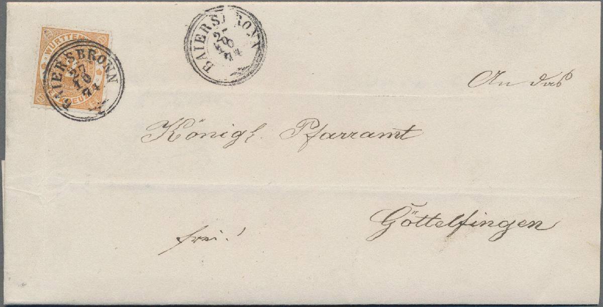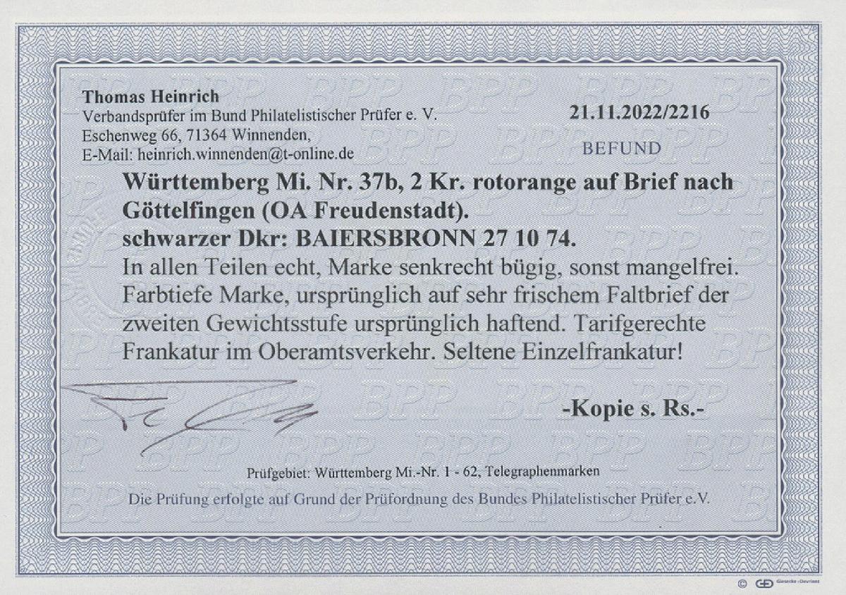 | Zusatzinformationen und Suchstichworte: | Christoph Gärtner 55. Auktion 20. - 24. Februar 2023 Los 5261 D Altdeutschland Württemberg 1874, Eirund-Ausgabe 2 Kr. rotorange (senkrechter Registraturbug) als tarifgerechte Einzelfrankatur auf Nahdistanzbrief der 2.Gewichtsstufe von "BAIERSBRONN 27.10.74" nach Göttelfingen. Fotobefund Heinrich BPP Ausruf 250,00 EUR |