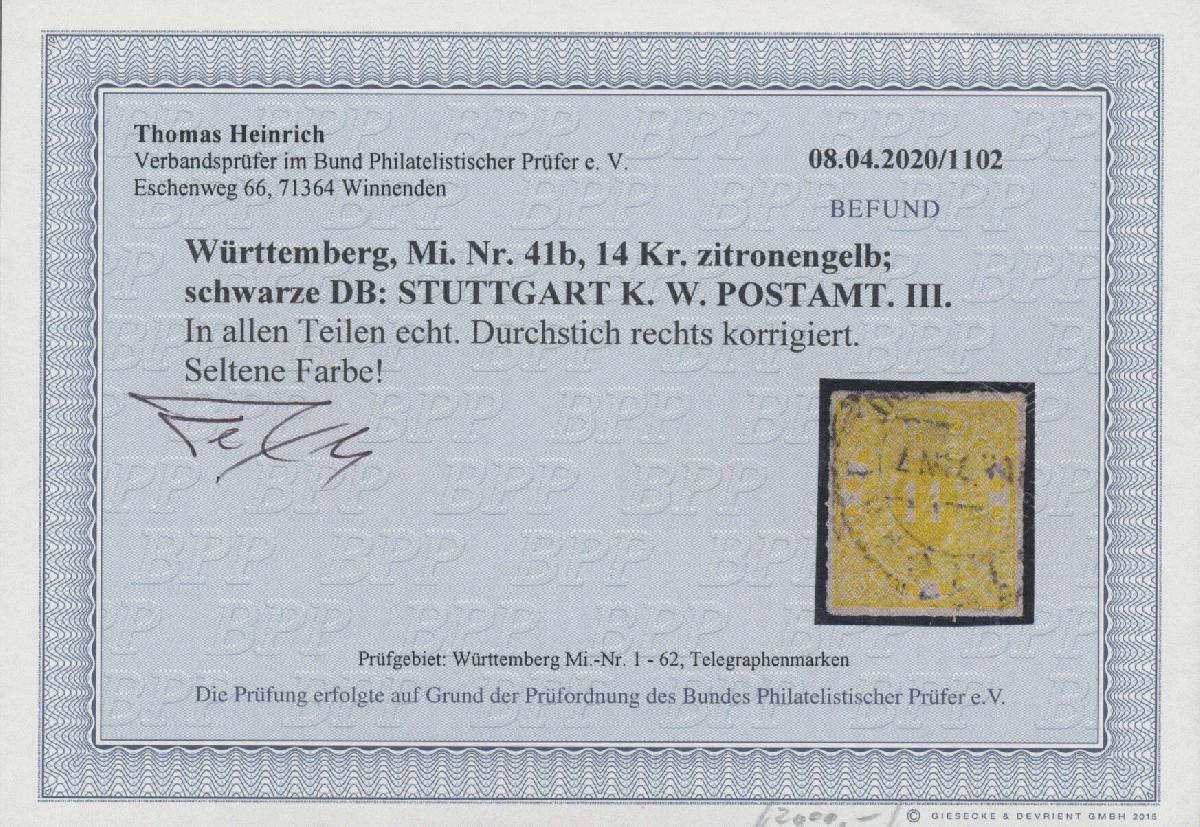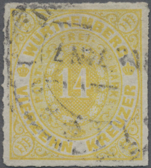 | Zusatzinformationen und Suchstichworte: | Christoph Gärtner 55. Auktion 20. - 24. Februar 2023 Los 5264 D Altdeutschland Württemberg 1869, 14 Kr. zitronengelb, farbtypisches Exemplar mit rechts korrigiertem Durchstich, gestempelt "STUTTGART". Fotobefund Heinrich BPP. Mi. 2.000,- € Ausruf 250,00 EUR |