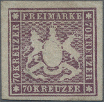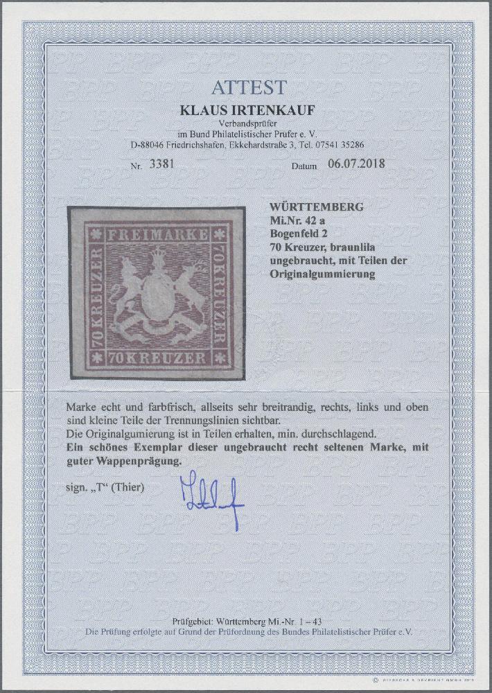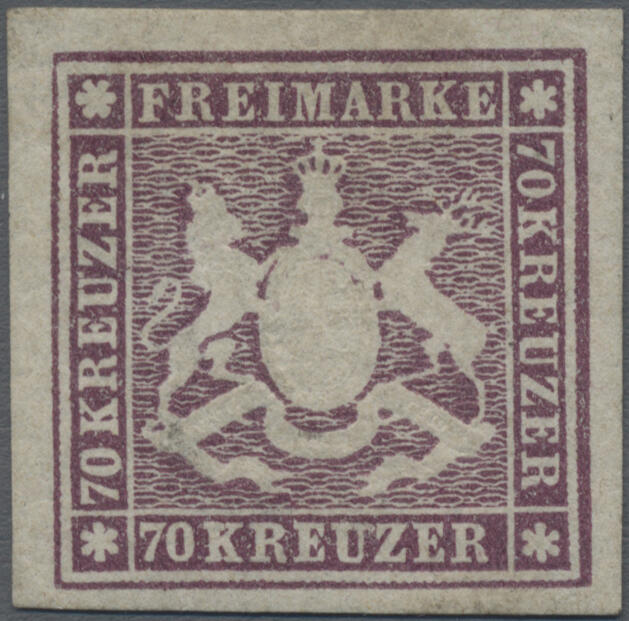 | Zusatzinformationen und Suchstichworte: | Christoph Gärtner 55. Auktion 20. - 24. Februar 2023 Los 5265 D Altdeutschland Württemberg 1873, 70 Kreuzer braunlila, Bogenfeld 2, ungebraucht mit Teilen der Originalgummierung, farbfrisch, allseits sehr breitrandig, rechts, links und oben kleine Teile der Trennungslinien sichtbar, min. durchschlagend, eine ungebraucht recht seltene Marke mit guter Wappenprägung. Signiert "T" (Thier), Attest Irtenkauf Ausruf 1.200,00 EUR |