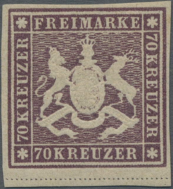 | Zusatzinformationen und Suchstichworte: | Christoph Gärtner 55. Auktion 20. - 24. Februar 2023 Los 5266 D Altdeutschland Württemberg 1873, Wappen, 70 Kr. violettbraun, Bogenfeld 5, farbfrisch, voll- bis breitrandig, unten mit voller Trennungslinie und kleinem Bogenrand. Laut Fotoattest Irtenkauf BPP (2018) ist die Originalgummierung gut erhalten, etwas verlaufen mit gummifreien Stellen. Was aber dem Gummiauftrag von Hand verdankt sein könnte - ein Falzrest o.ä. ist bei dieser schönen, gut geprägten Marke nicht zu finden. Mi.-Wert für ungebraucht 3.800 € Ausruf 800,00 EUR |