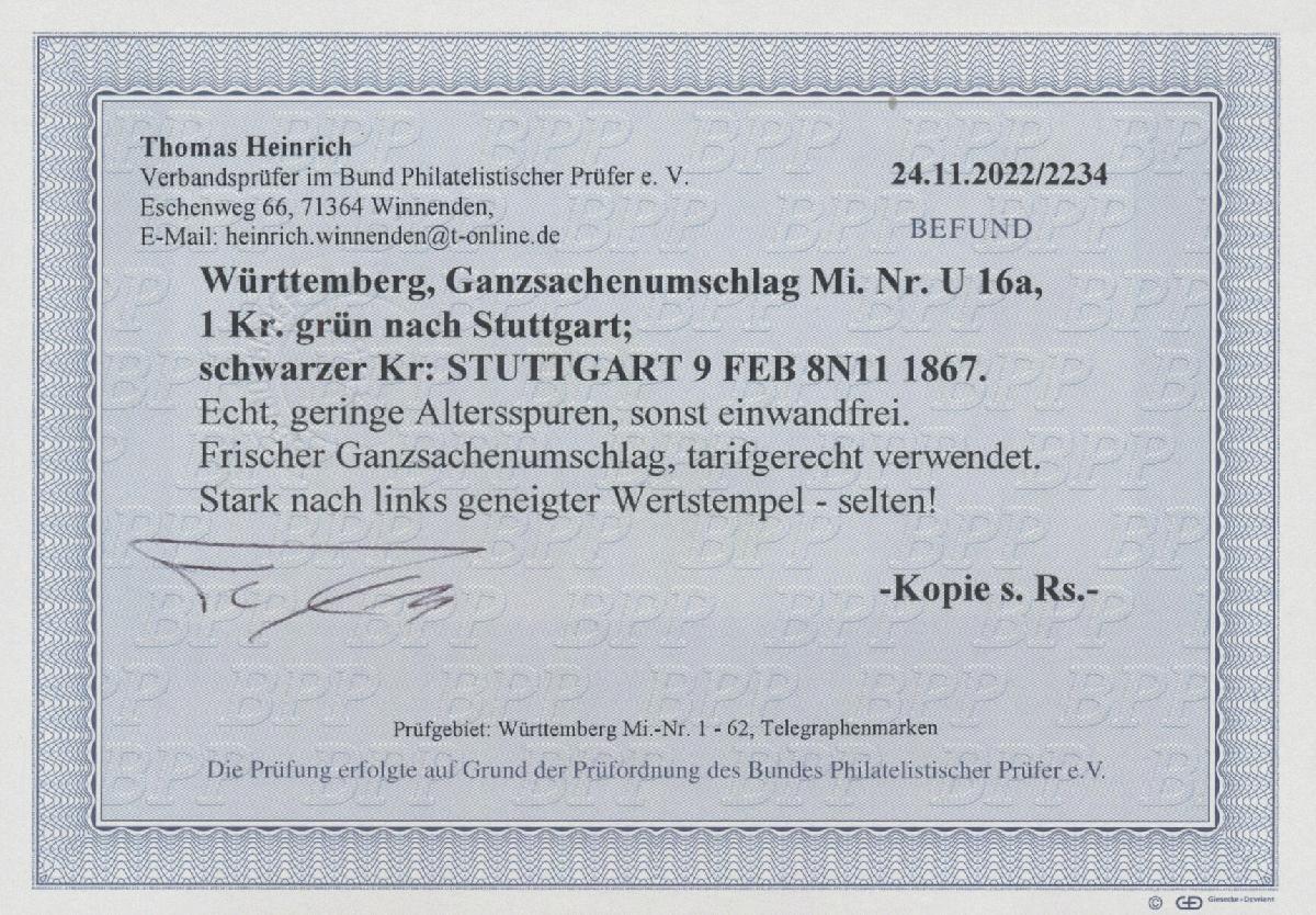 | Zusatzinformationen und Suchstichworte: | Christoph Gärtner 55. Auktion 20. - 24. Februar 2023 Los 5278 D Altdeutschland Württemberg 1867, Ganzsachenumschlag 1 Kr. grün mit Abart "verschobener Eindruck des Wertstempels=nach links geneigt", tarifgerecht gebraucht im Ortsverkehr von Stuttgart 9 FEB 1867, geringe Spuren. Fotobefund Heinrich BPP Ausruf 150,00 EUR |