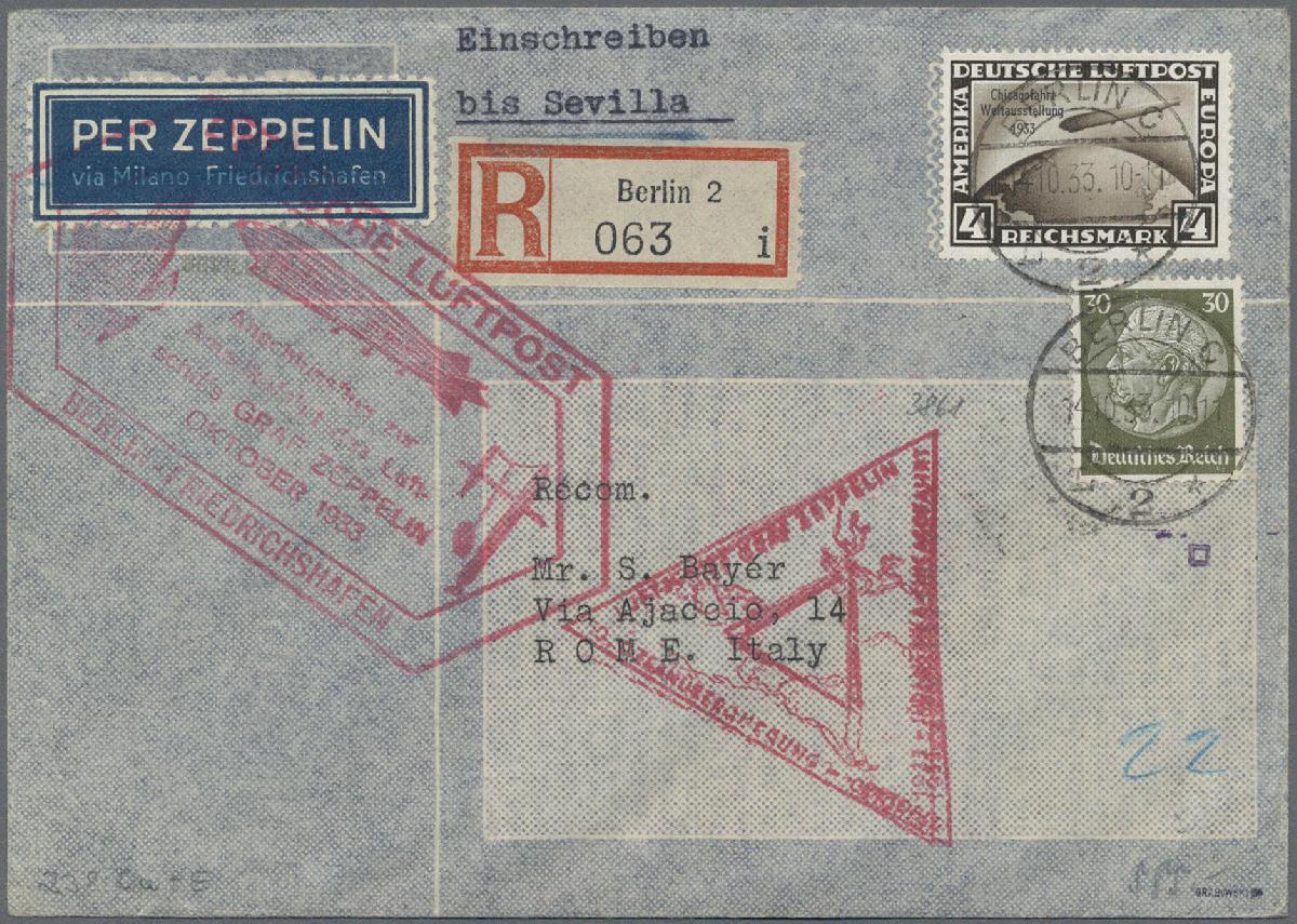 | Zusatzinformationen und Suchstichworte: | Christoph Gärtner 55. Auktion 20. - 24. Februar 2023 Los 3334 D Deutsches Reich 1933 "Chicagofahrt": Eingeschriebener Brief ab Berlin nach Rom mit Anschlussflug nach Friedrichshafen und mit Zeppelin nach Sevilla, frankiert mit entsprechender Zeppelinmarke zu 4 RM sowie Freimarke zu 30 Pf., alle gest. "BERLIN 14.10.33", mit Cachetstempeln des Zuleitungsfluges und der Zeppelinfahrt, rückseitig mit Stempeln von Sevilla, it. Bahnpost sowie Rom (4.11.33), in guter Erhaltung. Attest H. Grabowski (1978) Ausruf 150,00 EUR |