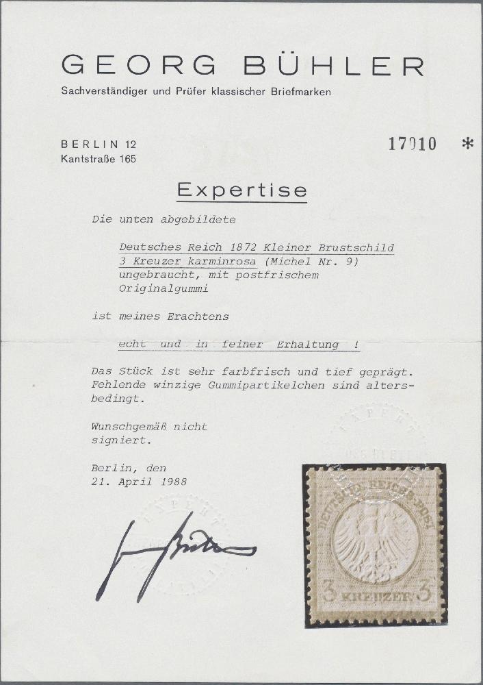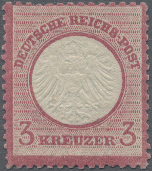 | Zusatzinformationen und Suchstichworte: | Christoph Gärtner 55. Auktion 20. - 24. Februar 2023 Los 5364 D Deutsches Reich, 1872 Kleiner Brustschild 1872, Kleiner Schild 3 Kr. karmin, ungebraucht mit postfrischem Originalgummi, ist echt und in feiner Erhaltung. Ungebraucht eine seltene Marke. Fotoattest Bühler (1988) (Mi€2.400,-) Ausruf 500,00 EUR 10.02.2023: Los zurückgezogen! |