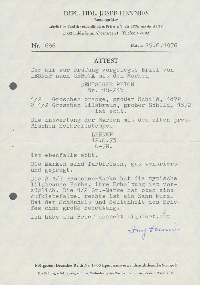 | Zusatzinformationen und Suchstichworte: | Christoph Gärtner 55. Auktion 20. - 24. Februar 2023 Los 5373 D Deutsches Reich, 1872 Grosser Brustschild 1872, Großer Schild 2½ Gr. rotbraun und ½ Gr. orange, zwei farbfrische Werte in guter Prägung (beide kl. Korrekturen) als tarifgerechte Frankatur auf Faltbriefhülle von "LENNEP 12 6 73" nach Genua mit rs. Ankunftsstempel 15.6., doppelt signiert Hennies BPP und Attest (1976) sowie Fotoattest Krug BPP. Trotz der kleinen Einschränkungen ein sehr attraktiver Brief Ausruf 100,00 EUR |