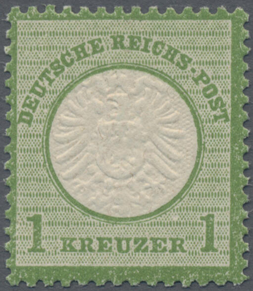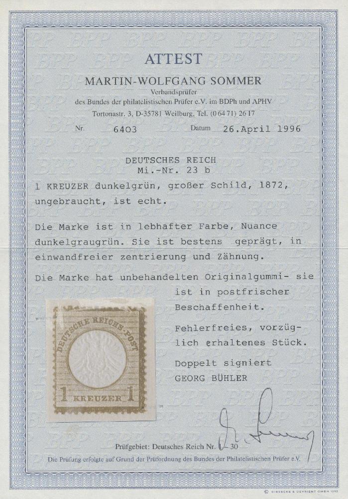 | Zusatzinformationen und Suchstichworte: | Christoph Gärtner 55. Auktion 20. - 24. Februar 2023 Los 5375 D Deutsches Reich, 1872 Grosser Brustschild 1872, 1 Kreuzer Großer Schild in der guten b-Farbe dunkelgrün, postfrisches Luxusstück mit Foto-Attest Sommer, BPP(1996): "Die Marke ist in lebhafter Farbe, bestens geprägt, in einwandfreier Zentrierung und Zähnung. Fehlerfreies, vorzüglich erhaltenes Stück." Doppelt signiert Bühler. RRR (Mi. 1.400,00 €) Ausruf 350,00 EUR |