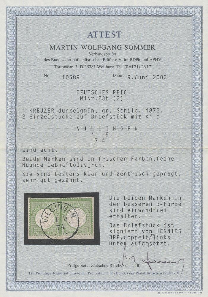 | Zusatzinformationen und Suchstichworte: | Christoph Gärtner 55. Auktion 20. - 24. Februar 2023 Los 5376 D Deutsches Reich, 1872 Grosser Brustschild 1872, Großer Schild 1 Kr. dunkelgrün (lebhaftolivgrün), zwei farbfrische Werte in guter Prägung und Zähnung auf Briefstück klar entwertet durch mittig aufgesetzten K1 "VILLINGEN 1 9 74", doppelt signiert Hennies BPP sowie Fotoattest Sommer BPP "einwandfrei". Mi. 1.600,- € Ausruf 250,00 EUR |