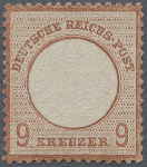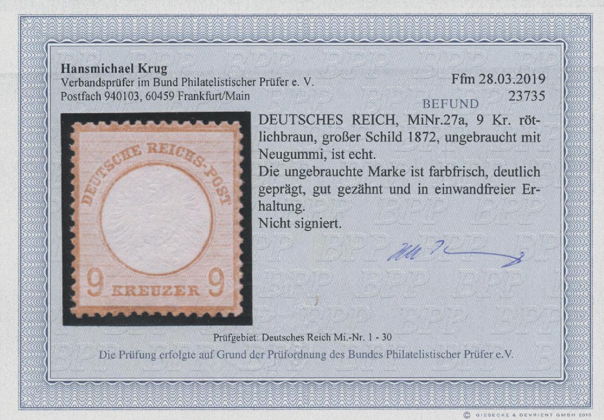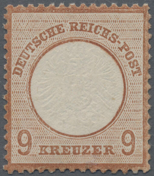 | Zusatzinformationen und Suchstichworte: | Christoph Gärtner 55. Auktion 20. - 24. Februar 2023 Los 5383 D Deutsches Reich, 1872 Grosser Brustschild 1872, Großer Schild 9 Kr. rötlichbraun, farbfrisches Exemplar in deutlicher Prägung und guter Zähnung, ungebraucht mit Neugummi, unsigniert. Fotobefund Krug BPP (2019) Ausruf 100,00 EUR |