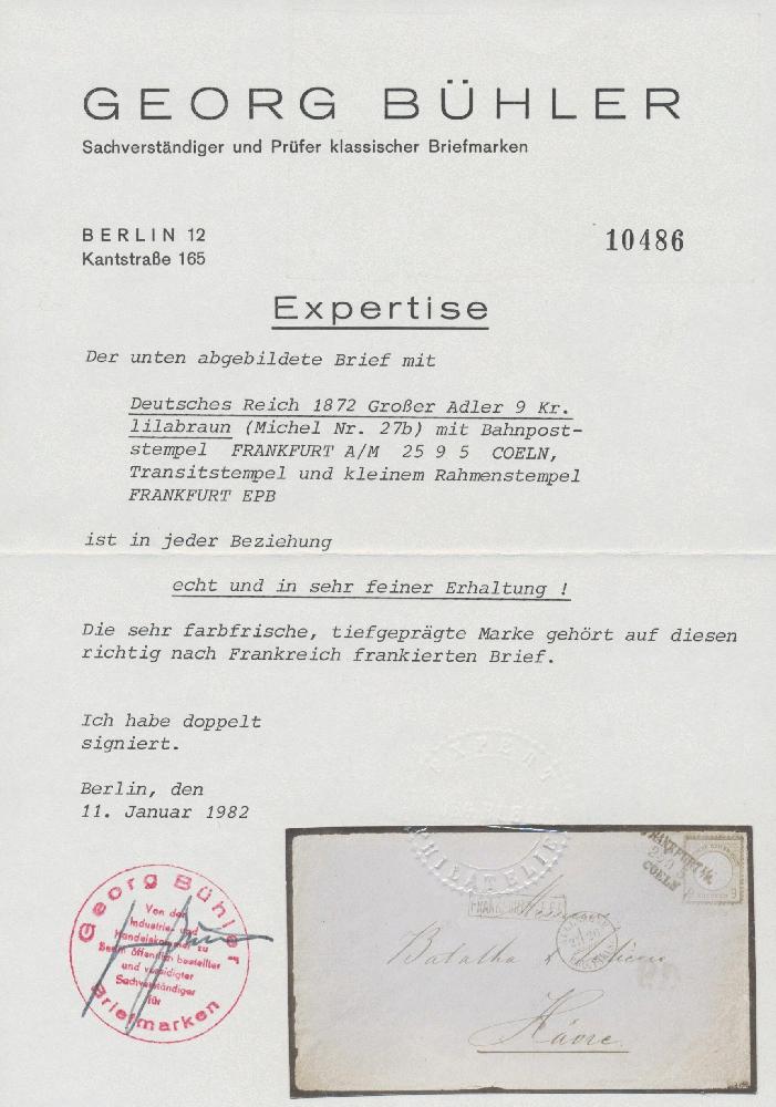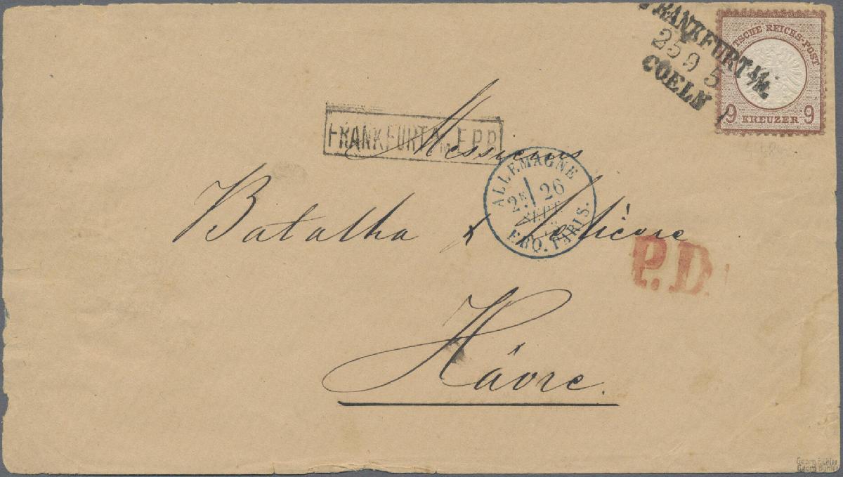| Zusatzinformationen und Suchstichworte: | Christoph Gärtner 55. Auktion 20. - 24. Februar 2023 Los 5390 D Deutsches Reich, 1872 Grosser Brustschild 1872, Großer Schild 9 Kr. mittelrotbraun, farbfrisches Exemplar in guter Prägung, Zähnung und Zentrierung als tarifgerechte Einzelfrankatur auf Brief von Frankfurt nach Le Havre/Frankreich, klar entwertet mit Bahnpost-L3 "FRANKFURT A/M / 25 9 5 / COELN" sowie nebengesetzter Ra1 "FRANKFURT A/M EPB", vs. blauer frz. Transitstempel vom nächsten Tag sowie rs. Ankunftsstempel. Das Kuvert rs. mit Spuren/teils Fehlstellen, rechts oben schwache Eckstauchung, auch die Marke betreffend. Doppelt signiert Georg Bühler und Fotoattest (1982) sowie Fotoattest Krug BPP "Die Marke...in einwandfreier Erhaltung". Mi. 1.200,- €. Ein schöner und wirkungsvoller Brief! Ausruf 250,00 EUR |