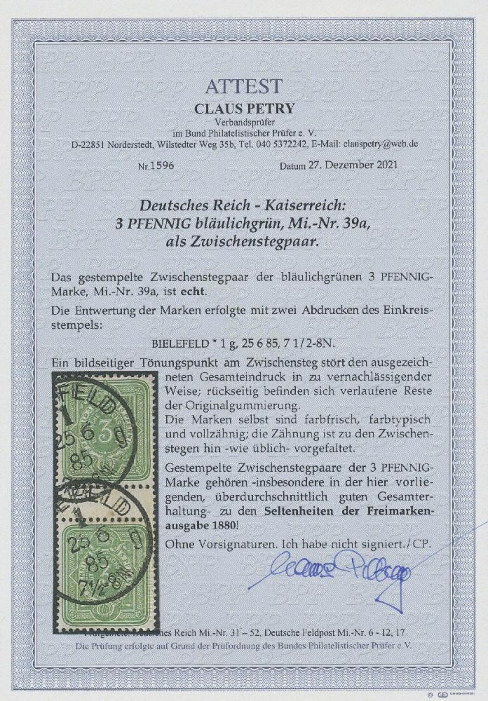 | Zusatzinformationen und Suchstichworte: | Christoph Gärtner 55. Auktion 20. - 24. Februar 2023 Los 5399 D Deutsches Reich, 1880/89 Pfennig 1885, 3 Pfennig grün im farbfrischen und gut gezähnten senkrechten Zwischenstegpaar, sauber und klar entwertet "BIELEFELD 25.6.85", übliche Zähnungsvorfaltung und unmerklicher Tönungspunkt im Zwischensteg, rs. Teile des Originalgummis sichtbar. Ausführliches Fotoattest Petry BPP "überdurchschnittlich gute Gesamterhaltung". Gestempelte Zwischenstegpaare der 3 Pfg. sind sehr selten! Ausruf 500,00 EUR |