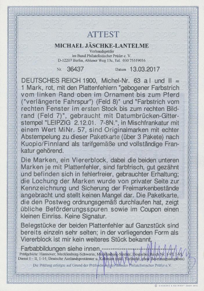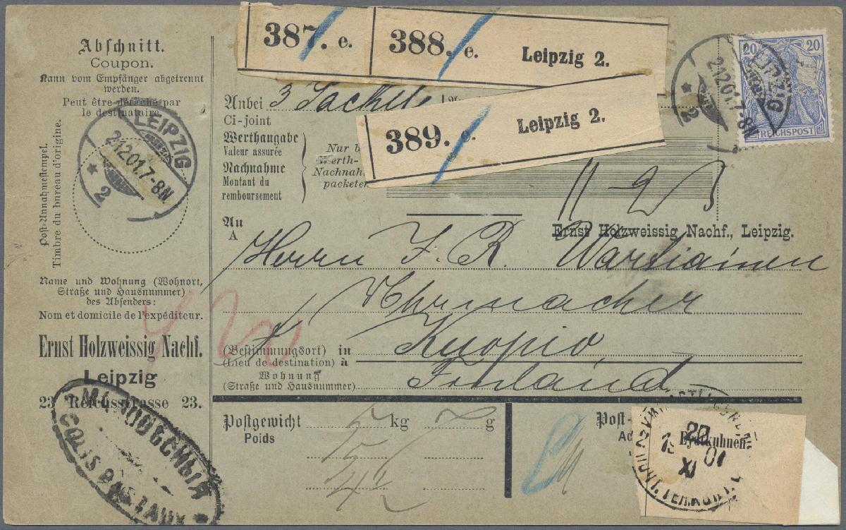 | Zusatzinformationen und Suchstichworte: | Christoph Gärtner 55. Auktion 20. - 24. Februar 2023 Los 5413 D Deutsches Reich, Germania Reichspost 1900, 1 M Reichspostamt im Viererblock mit den beiden Plattenfehlern Feld 8 "verlängerte Fahrspur" und Feld 7 "Farbstrich vom rechten Fenster..." rs. auf Paketkarte über 3 Pakete von Leipzig nach Kuopio/Finnland, alle 5 Werte mit Firmenlochung (Perfins). Laut FFA Jäschke-L. " sind die Marken echt, farbfrisch, gut gezähnt und in fehlerfreier gebrauchter Erhaltung. Die Paketkarte zeigt übliche Beförderungsspuren. Belegstücke der beiden Plattenfehler auf Ganzstück sind bereits einzeln sehr selten, als Viererblock ist mir kein weiteres Stück bekannt", Katalogwert laut J.-L. ca. 10000.- (T) Ausruf 1.000,00 EUR |