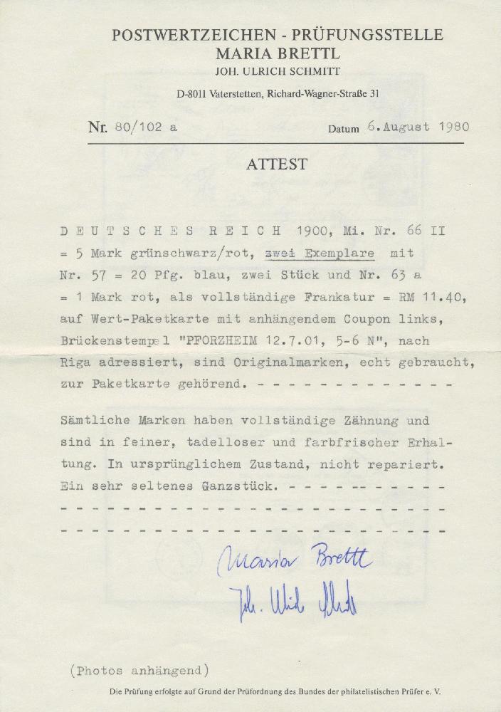 | Zusatzinformationen und Suchstichworte: | Christoph Gärtner 55. Auktion 20. - 24. Februar 2023 Los 5418 D Deutsches Reich, Germania Reichspost 1901, 5 Mk. Reichspost Type II mit ZuF(rs.) auf Wert-Paketkarte von Pforzheim nach Riga, laut FA Brettl " echt. Marken mit vollständiger Zähnung und in feiner, tadelloser und farbfrischer Erhaltung. Ein sehr seltenes Ganzstück". Mi. 3000.- Ausruf 500,00 EUR |
