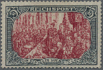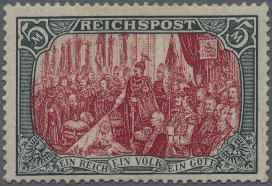 | Zusatzinformationen und Suchstichworte: | Christoph Gärtner 55. Auktion 20. - 24. Februar 2023 Los 5420 D Deutsches Reich, Germania Reichspost 1900, 5 Mk Reichspost, Michel.-Nr.66 Z, grünschwarz/bräunlichkarmin, sog. Zwischentype aus Rahmen der Type I und Mittelstück der Type II, ungebraucht mit Neugummi, einigen nachgestochenen Zahnlöchern sowie unmerklich hell, darüber hinaus gut erhalten und insbesondere bildseitig ausgesprochen farbfrisch, sehr selten und nur in wenigen Exemplaren bekannt, Attest Jäschke-Lantelme. Michel für ungebraucht: 30000 € Ausruf 3.000,00 EUR |