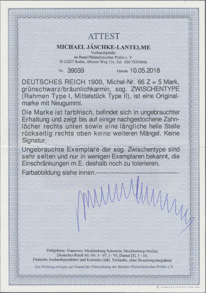 | Prüfer: | Jäschke-Lantelme, Michael (BPP (Bund Philatelistischer Prüfer)) |