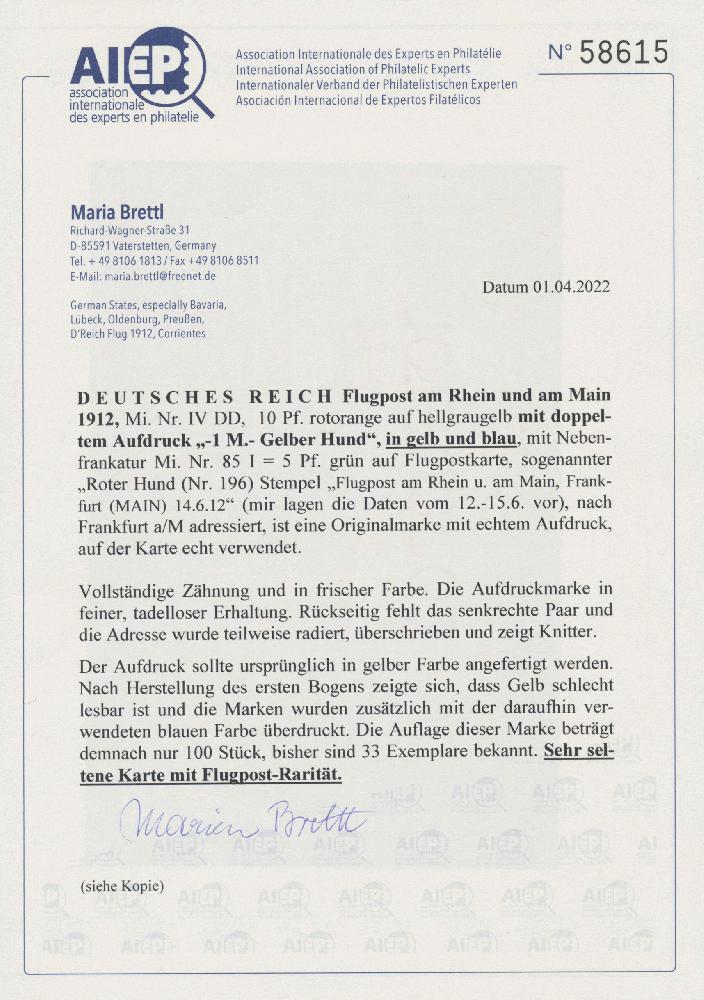 | Zusatzinformationen und Suchstichworte: | Christoph Gärtner 55. Auktion 20. - 24. Februar 2023 Los 5440 D Deutsches Reich 1912 (10 Juni), Flugpostmarke 10 Pf. rotorange mit extrem seltenen doppeltem Aufdruck "- 1 M - Gelber Hund" in gelb und blau, noch ursprünglich haftend auf (roter) Flugpostkarte No 196 mit Beifrankatur 5 Pfg Germania, sogenannter "Roter Hund". Die Aufdruckmarke ist in feiner, tadelloser Erhaltung mit vollständiger Zähnung und in frischer Farbe. Bei der Karte fehlt rückseitig das senkrechte Paar, die Adresse wurde teilweise radiert und überschrieben und ist teils leicht knittrig. Der Aufdruck sollte ursprünglich in gelber Farbe erfolgen - in Anspielung auf die Euler-Flugmaschine "Gelber Hund", mit der dieser Karten garantiert befördert werden sollten. Nach dem Druck des ersten Bogens stellte man fest, dass Gelb auf Orange schlecht lesbar ist, und man entschied, statt dessen den Überdruck in Blau vorzunehmen. Der schon Gelb überdruckte Bogen wurde offensichtlich nochmals überdruckt und unerkannt für die Frankierung der nummerierten Karten verwendet. Atteste Arge Zeppelinpost (2013) und Maria Brettl (2022). "Ein echtes, bedeutendes Spitzenstück der Flugpost Rhein-Main, stammend aus dem erst 2013 gemachten Fund Roter Hund Karten adressiert an Mathias Sieber bzw. Joe Livingstone, Frankfurt-Main". Ausruf 7.000,00 EUR |