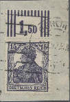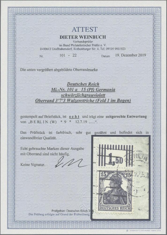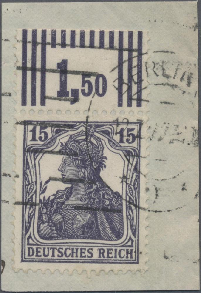 | Zusatzinformationen und Suchstichworte: | Christoph Gärtner 55. Auktion 20. - 24. Februar 2023 Los 5448 D Deutsches Reich, Germania mit WZ 1917, 15 Pf. Germania schwärzlichgrauviolett vom Oberrand mit Walzenstriche 3´7´3 auf Briefstück, laut FFA Weinbuch "echt und einwandfrei", Mi. 650.-+ Ausruf 100,00 EUR |