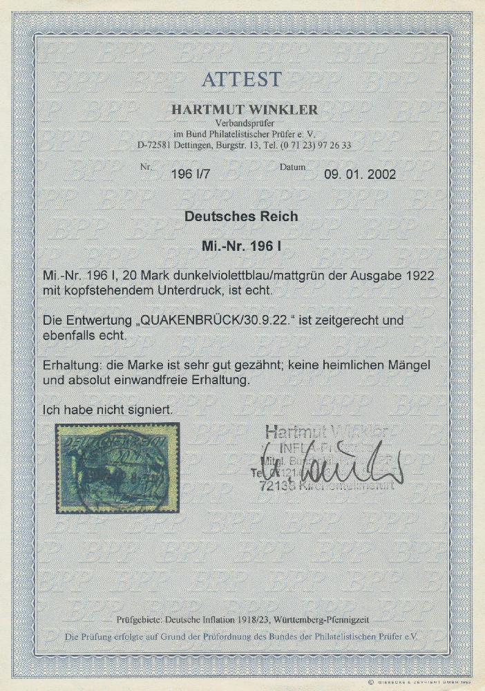 | Prüfgebiet: | Deutsches Reich 1919 - 1923 (Mi-Nr. 107 - 343) |