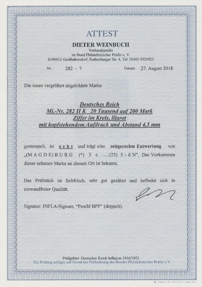 | Zusatzinformationen und Suchstichworte: | Christoph Gärtner 55. Auktion 20. - 24. Februar 2023 Los 5470 D Deutsches Reich, 1918/23 Inflationsausgaben 1923, 20 Tsd. auf 200 M. mit kopfstehendem Aufdruck (weiter Abstand, Plattendruck), gestempeltes Kabinettstück mit Fotoattesten Dr. Oechsner BPP und aktuell Weinbuch BPP: "echt... in einwandfreier Qualität", seltene Marke! Ausruf 750,00 EUR |