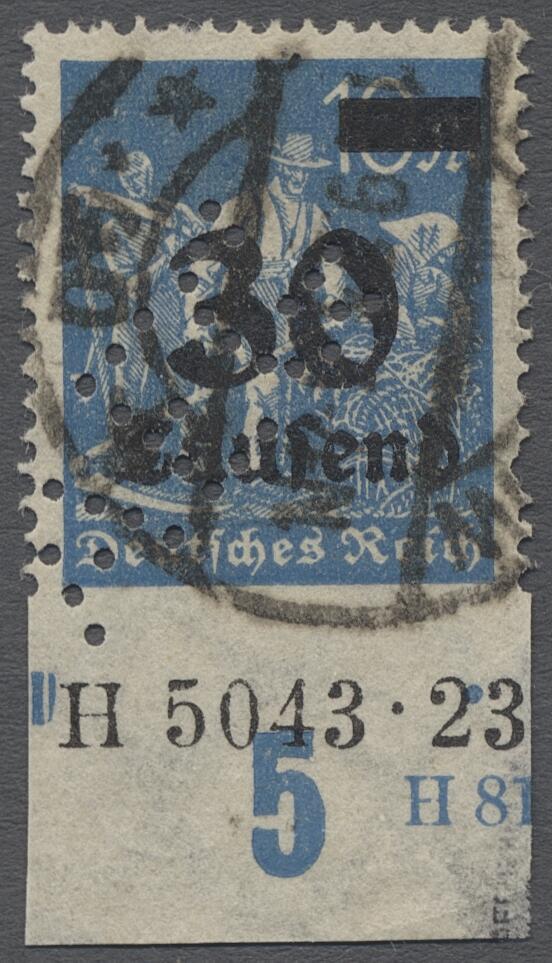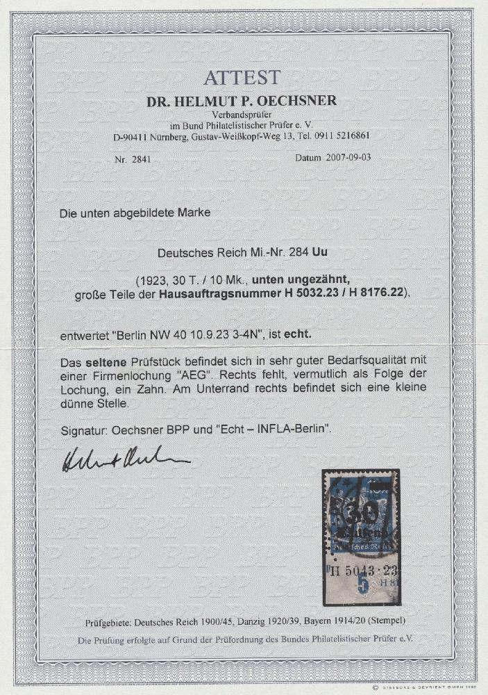 | Zusatzinformationen und Suchstichworte: | Christoph Gärtner 55. Auktion 20. - 24. Februar 2023 Los 5471 D Deutsches Reich, 1918/23 Inflationsausgaben 1923, Aufdruckausgabe, 30 Tausend auf 10 M., UNTEN UNGEZÄHNT, mit kompletter Hausauftragsnummer "H 5043 . 23" des Überdrucks sowie Anfang der Original-HAN "H 8", entwertet "Berlin NW 40 / 10.9.23". Die Marke befindet sich in sehr guter Bedarfsqualität. Ein Zahn fehlt, vermutlich aufgrund der Firmenlochung "AEG", am Unterrand rechts eine kleine dünne Stelle. Geprüft Oechsner / INFLA Berlin, Fotoattest Oechsner (2007) Ausruf 350,00 EUR |