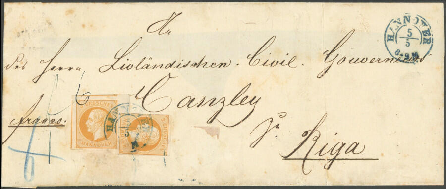 | Zusatzinformationen und Suchstichworte: | nordphila 492. Briefmarkenfernauktion 7. August 2023 Los 186 Altdeutschland Hannover 1859, 3 Gr. gelborange, 2x auf Briefhülle, linke Marke riesenrandiges Prachtstück mit Reihenzähler "6", rechte Marke teils angeschnitten auf Briefhülle von "HANNOVER" nach Riga!, Frankatur unvollständig, Fotobefund Berger Ausruf 180,00 EUR |