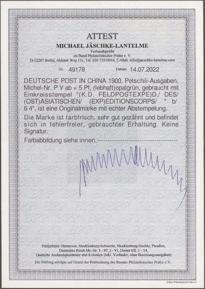 | Prüfgebiet: | Deutsche Auslandspostämter China Petschili-Ausgaben |