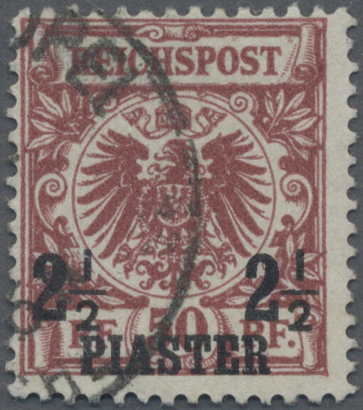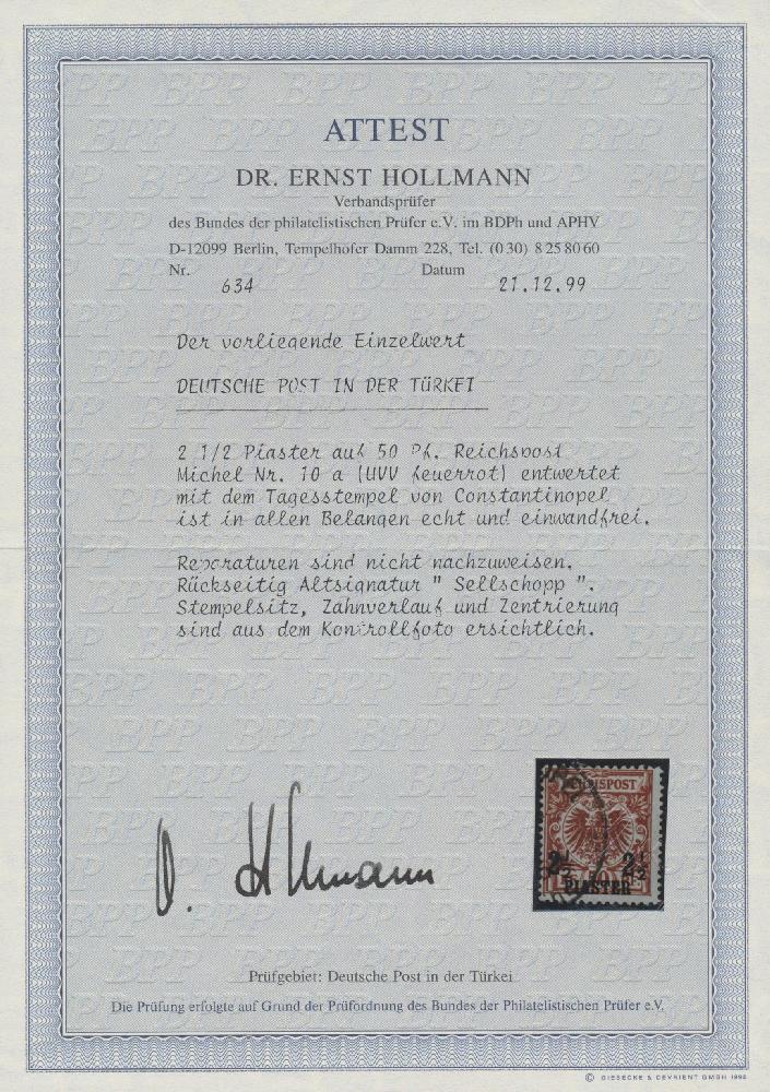 | Zusatzinformationen und Suchstichworte: | Christoph Gärtner 55. Auktion 20. - 24. Februar 2023 Los 5717 D Deutsche Auslandspost Türkei 1889, 2 1/2 Pia auf 50 Pf bräunlichrot Krone/Adler entwertet mit Tagesstempel von Constantinopel, Fotoattest Hollmann BPP (1999) "...ist in allen Belangen echt und einwandfrei." GEBOT |