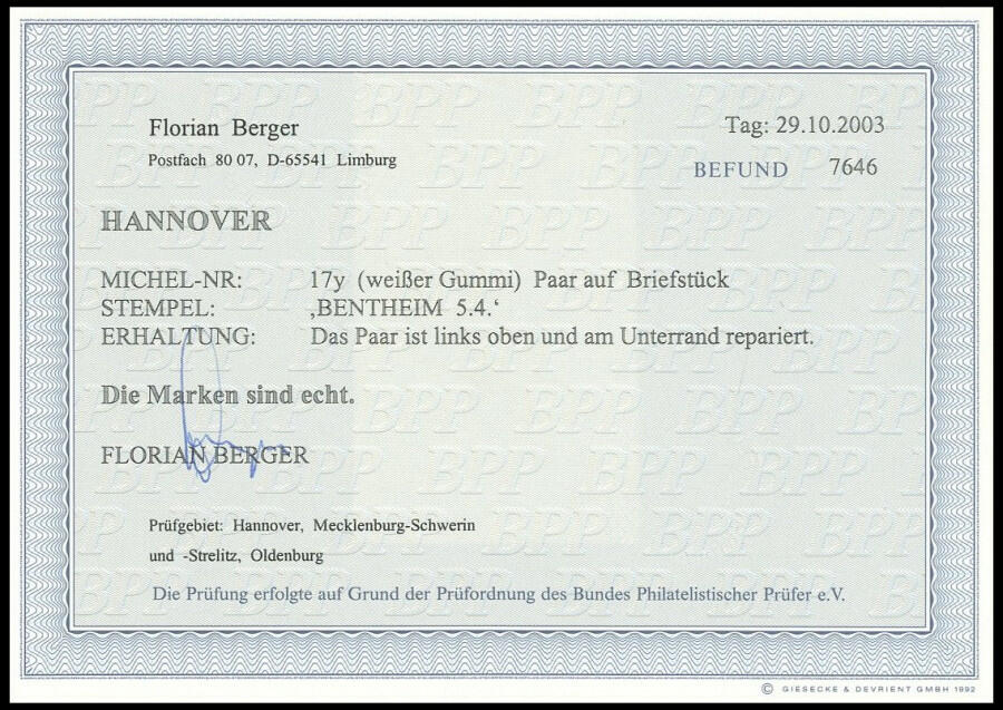 | Prüfer: | Berger, Florian (BPP (Bund Philatelistischer Prüfer)) |