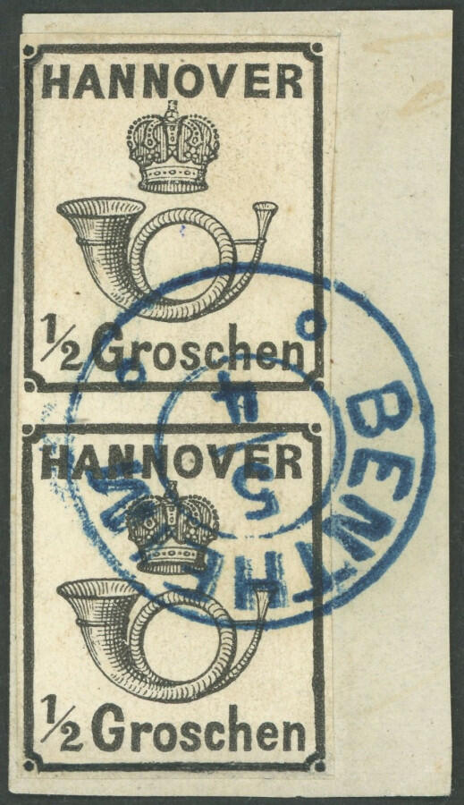 | Zusatzinformationen und Suchstichworte: | nordphila 492. Briefmarkenfernauktion 7. August 2023 Los 191 Altdeutschland Hannover 1860, ½ Gr. schwarz im senkrechten Paar, blauer K2 "BENTHEIM", repariert wie Pracht, Fotobefund Berger, Mi. (600.-) Ausruf 90,00 EUR |