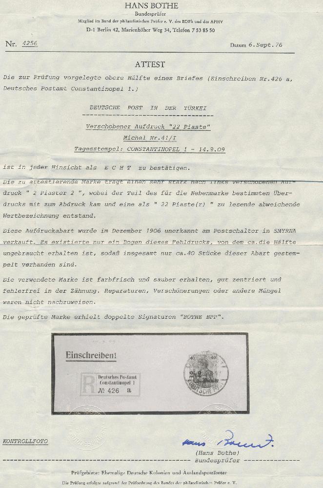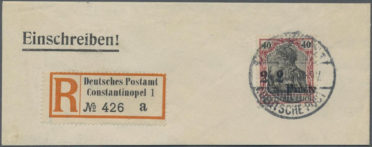 | Zusatzinformationen und Suchstichworte: | Christoph Gärtner 55. Auktion 20. - 24. Februar 2023 Los 5722 D Deutsche Auslandspost Türkei 1905, 2 Piaster auf 40 Pfg Germania, extrem stark verschobener Aufdruck zentrisch gestempelt CONSTANTINOPEL 1 14.9.09 auf großem R-Briefteil in farbfrischer und gut gezähnter Luxus-Erhaltung, Fotoatteste Bothe (09/1976) sowie Jäschke-Lantelme/BPP (11/2018) Ausruf 1.500,00 EUR |