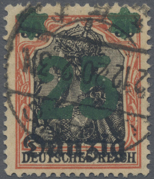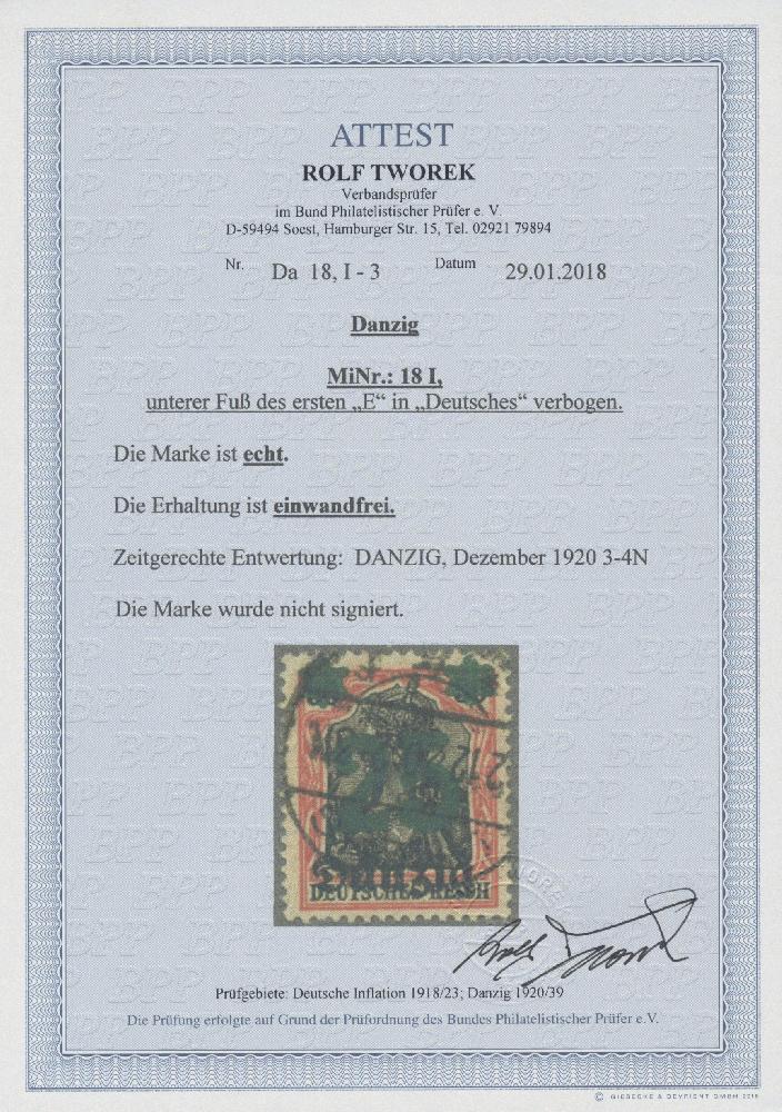 | Zusatzinformationen und Suchstichworte: | Christoph Gärtner 55. Auktion 20. - 24. Februar 2023 Los 5942 D Danzig 1920, Germania mit Überdruck, 25 auf 30 Pfg. mit Plattenfehler I, zeitgerechte Entwertung DANZIG, Mi o. Preis, Foto-Attest Tworek (2018) Ausruf 100,00 EUR |