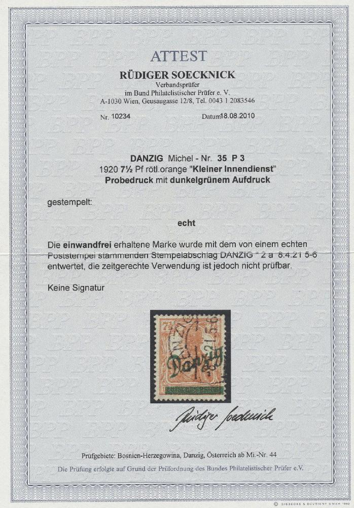 | Zusatzinformationen und Suchstichworte: | Christoph Gärtner 55. Auktion 20. - 24. Februar 2023 Los 5943 D Danzig 1920, Kleiner Innendienst, Germania 7 1/2 Pfg. rötlichorange mit PROBEAUFDRUCK in DUNKELGRÜN, einwandfrei erhalten, bis auf zwei etwas stumpfere Zähne rechts oben gut gezähnt, entwertet mit dem echten Poststempel "Danzig 2 a / 8.4.21". Alle drei vorliegenden Fotoatteste schreiben, eine zeitgerechte Verwendung sei leider nicht prüfbar, zuletzt Soecknick 2010. Tröstlich, dass der Mi.-Wert von 2.000 € ohnehin für Gefälligkeitsstempel gilt Ausruf 500,00 EUR |