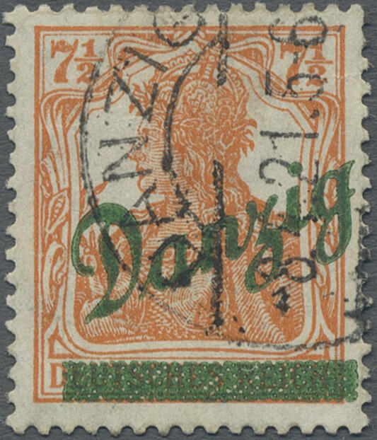 | Zusatzinformationen und Suchstichworte: | Christoph Gärtner 55. Auktion 20. - 24. Februar 2023 Los 5943 D Danzig 1920, Kleiner Innendienst, Germania 7 1/2 Pfg. rötlichorange mit PROBEAUFDRUCK in DUNKELGRÜN, einwandfrei erhalten, bis auf zwei etwas stumpfere Zähne rechts oben gut gezähnt, entwertet mit dem echten Poststempel "Danzig 2 a / 8.4.21". Alle drei vorliegenden Fotoatteste schreiben, eine zeitgerechte Verwendung sei leider nicht prüfbar, zuletzt Soecknick 2010. Tröstlich, dass der Mi.-Wert von 2.000 € ohnehin für Gefälligkeitsstempel gilt Ausruf 500,00 EUR |
