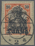 | Zusatzinformationen und Suchstichworte: | Christoph Gärtner 55. Auktion 20. - 24. Februar 2023 Los 5945 D Danzig 1920, 1 M. auf 30 Pfg Germania mit Netzunterdruck "Spitzen nach oben", ohne Wertaufdruck, Feld 96/97 nur einer kleinen Teilauflage, zentrisch, klar und gerade aufsitzend entwertet mit echtem Stempel "DANZIG 2a 9.7.21" auf einem kleinen Liebhaber-Briefstück, abgesehen von verkürzten Zahnspitzen in einwandfreier Qualität, neben zwei Teil-Brücken auf Trübsbach-Briefen ist es lt. Attest das einzige bekannte gestempelte Exemplar. Signiert Stolow. Atteste Oechsner und Soecknick BPP Ausruf 1.200,00 EUR |