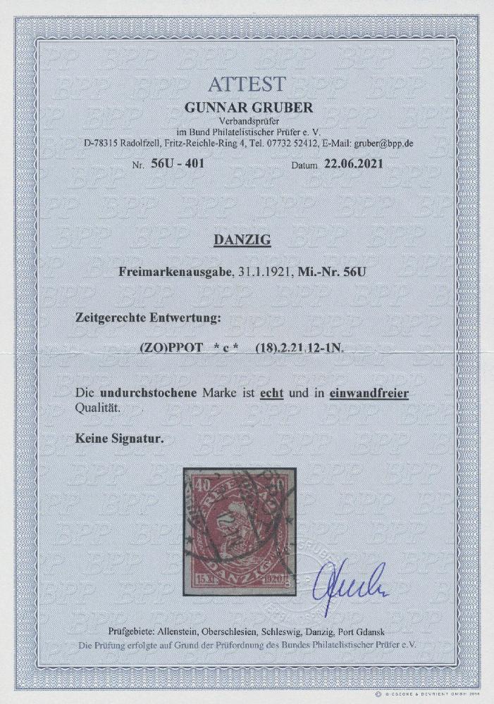 | Zusatzinformationen und Suchstichworte: | Christoph Gärtner 55. Auktion 20. - 24. Februar 2023 Los 5948 D Danzig 1921, 40 Pfg Kogge ungezähnt, zeitgerecht gestempelt "ZOPPOT * c * (18) 2.21" in breitrandiger Prachterhaltung. Attest Gruber BPP Ausruf 500,00 EUR |