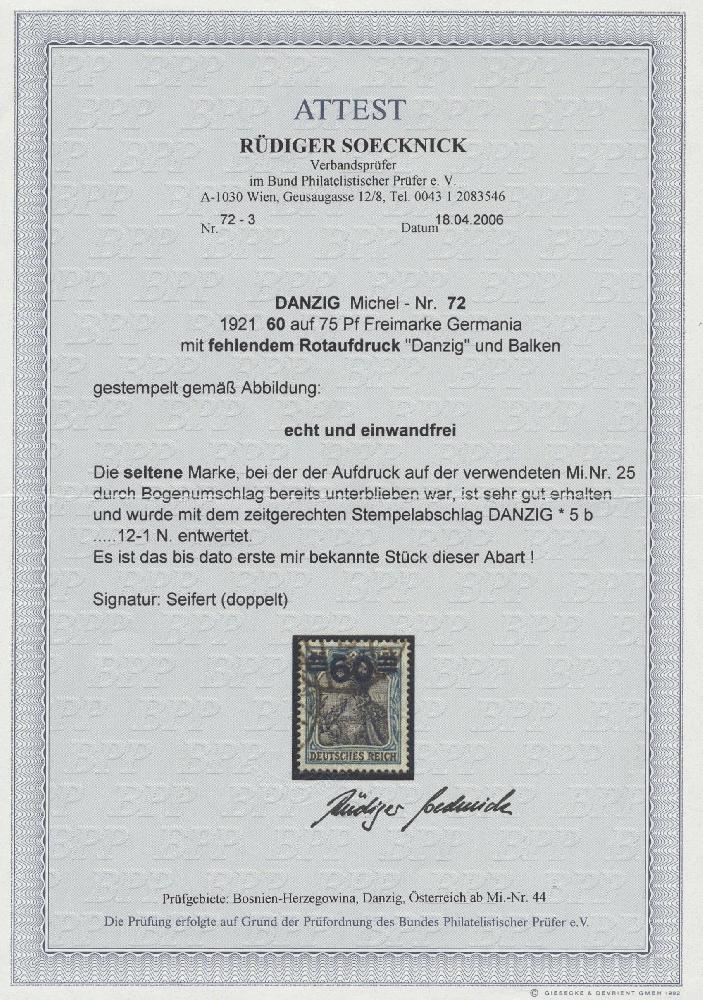 | Zusatzinformationen und Suchstichworte: | Christoph Gärtner 55. Auktion 20. - 24. Februar 2023 Los 5951 D Danzig 1921, Germania, 60 auf 75 Pfg. Germania ohne Aufdruck des Landesnamens, entwertet mit zeitgerechtem Stempel "Danzig 5 b". Geprüft Seifert, Fotoatteste Dr. Oechsner und Soecknick (2006). Soecknick: " ... das erste mir bekannte Stück dieser Abart" Ausruf 2.000,00 EUR |