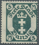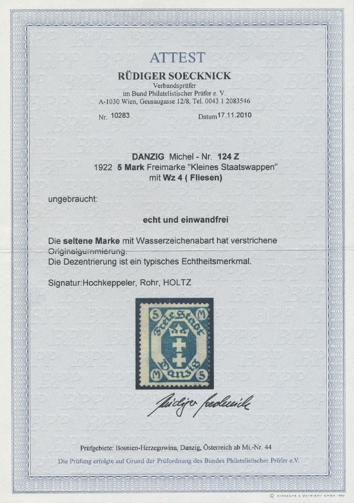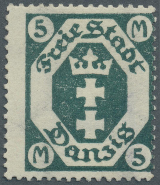 | Zusatzinformationen und Suchstichworte: | Christoph Gärtner 55. Auktion 20. - 24. Februar 2023 Los 5953 D Danzig 1922, 5 Mark Freimarke schwärzlichopalgrün 'Kleines Staatswappen' mit seltenem Wasserzeichen 'FLIESEN' statt Wz 3. Tadellos gezähntes, ungebrauchtes Kabinettstück mit für diese Marke typischer Dezentrierung. Eine seltene Marke! Fotoattest Soecknick/BPP Ausruf 1.000,00 EUR |