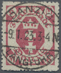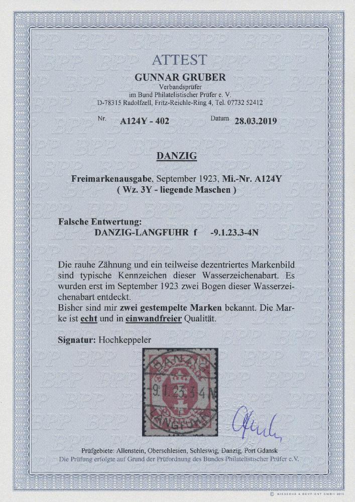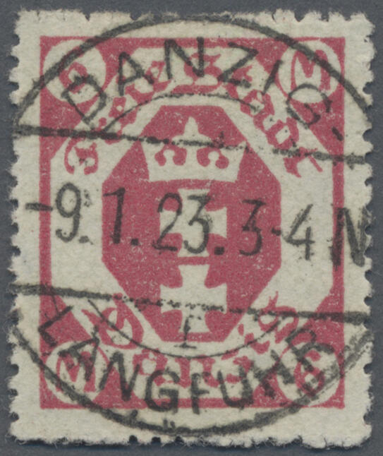 | Zusatzinformationen und Suchstichworte: | Christoph Gärtner 55. Auktion 20. - 24. Februar 2023 Los 5954 D Danzig 1922, Freimarke Kleines Staatswappen, 6 Mark rotkarmin, mit liegendem Wasserzeichen. Die raue Zähnung und ein teilweise dezentriertes Markenbild sind typische Kennzeichen dieser Wasserzeichenabart. Die Marke ist falsch entwertet "DANZIG-LANGFUHR f -9.1.23. 3-4N", bisher sind nur zwei gestempelte Marken bekannt. "Die Marke ist echt und in einwandfreier Qualität", Fotoattest Gruber BPP Ausruf 2.500,00 EUR |