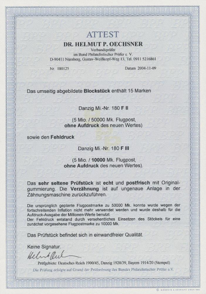 | Zusatzinformationen und Suchstichworte: | Christoph Gärtner 55. Auktion 20. - 24. Februar 2023 Los 5958 D Danzig 1923, Flugpostmarken im verzähnten 16er-Block, enthaltend 15 Marken 5 Mio/ 50.000 M ohne Aufdruck des neuen Wertes und 5 Mio/ 10.000 M ohne Aufdruck des neuen Wertes. Das sehr seltene Blockstück ist echt und postfrisch, die Verzähnung ist auf ungenaue Anlage in der Zähnungsmaschine zurückzuführen, Fotoattest Dr. Oechsner BPP Ausruf 2.800,00 EUR11 |