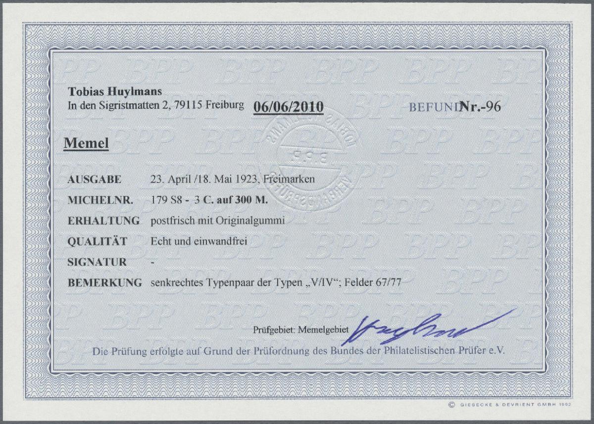 | Zusatzinformationen und Suchstichworte: | Christoph Gärtner 55. Auktion 20. - 24. Februar 2023 Los 6002 D Memel 1923, Freimarken 300 M oliv mit Aufdruck 3 C im postfrischen senkrechten Paar in Type V/IV, "echt und einwandfrei", Fotobefund Huylmans BPP (Mi€650,-) Ausruf 80,00 EUR |