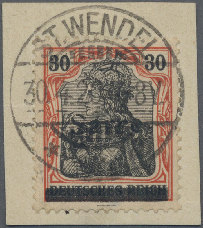 | Zusatzinformationen und Suchstichworte: | Christoph Gärtner 55. Auktion 20. - 24. Februar 2023 Los 5818 D Saar 1920, 30 Pfg. Germania/Sarre in dunkelrotorange/schwarz auf orangeweiß, Aufdruck Type III, entwertet mit echtem Stempel "ST. WENDEL * * a 30.4.20 7-8 V.", doppelt signiert Burger BPP, Fotoattest H. Ney BPP Ausruf 130,00 EUR |