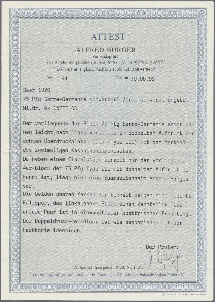 | Prüfer: | Burger, Alfred (BPP (Bund Philatelistischer Prüfer)) |
