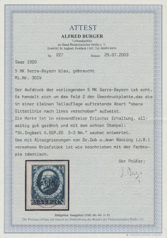 | Prüfgebiet: | Saargebiet (Mi-Nr. 1 - 205) |