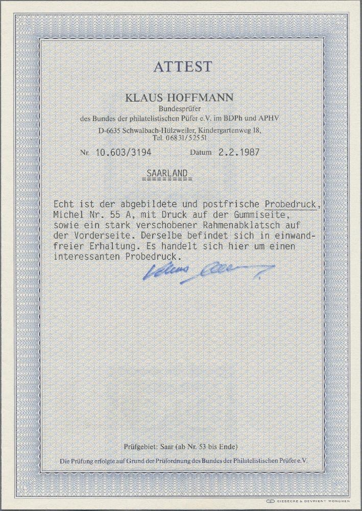 | Zusatzinformationen und Suchstichworte: | Christoph Gärtner 55. Auktion 20. - 24. Februar 2023 Los 5844 D Saar 1921, Landschaftsbilder (I) 20 Pf Probedruck mit Druck auf der Gummiseite, sowie ein stark verschobener Rahmenabklatsch auf der Vorderseite. Fotoattest Hoffmann BPP Ausruf 40,00 EUR |