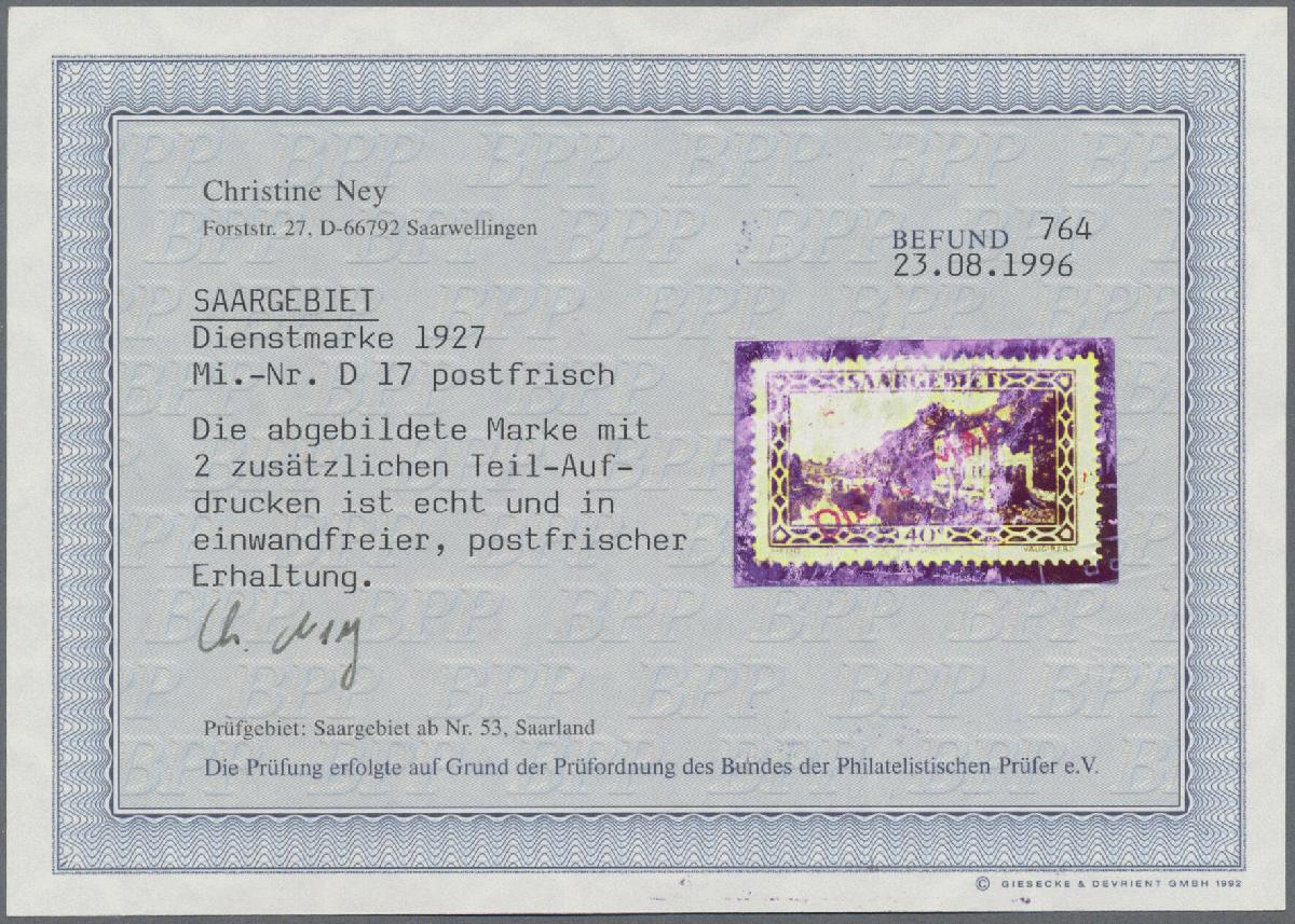 | Zusatzinformationen und Suchstichworte: | Christoph Gärtner 55. Auktion 20. - 24. Februar 2023 Los 5915 D Saar 1927, Freimarke: 40 Ct schwärzlicholivbraun mit gelblichrotem Aufdruck und 2 zusätzlichen Teil-Aufdrucken, echt und in einwandfreier, postfrischer Erhaltung. Fotobefund Ney BPP Ausruf 50,00 EUR |