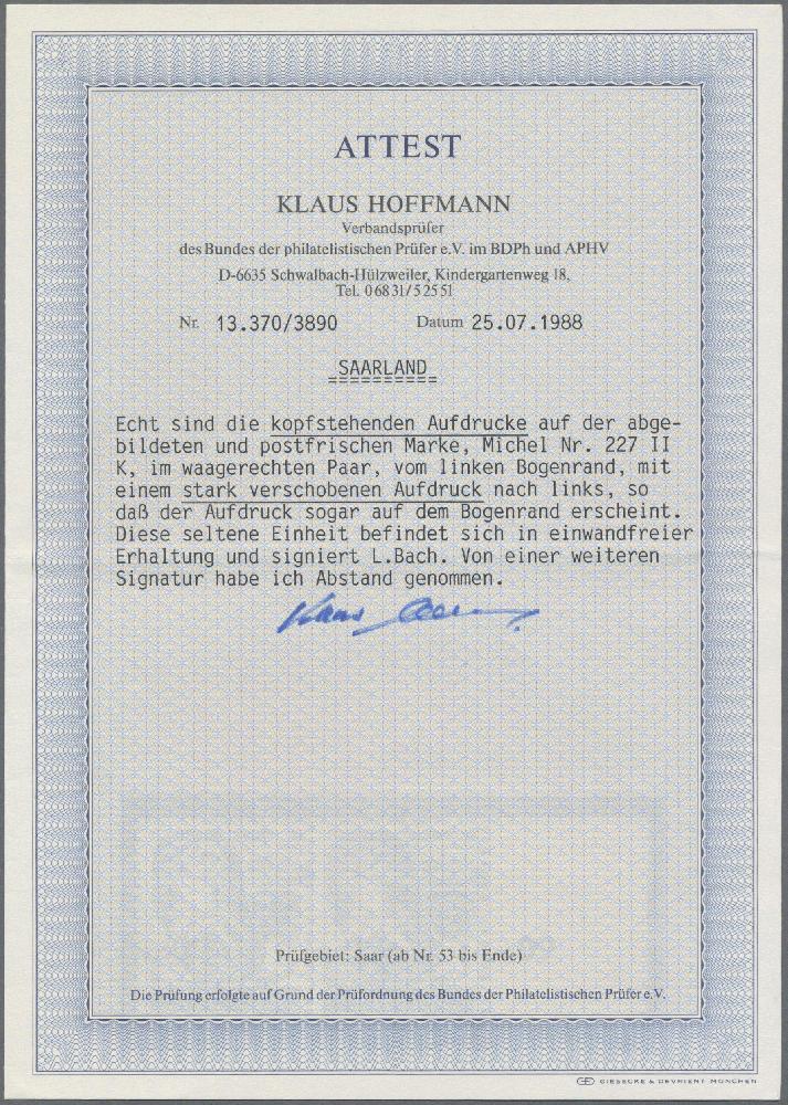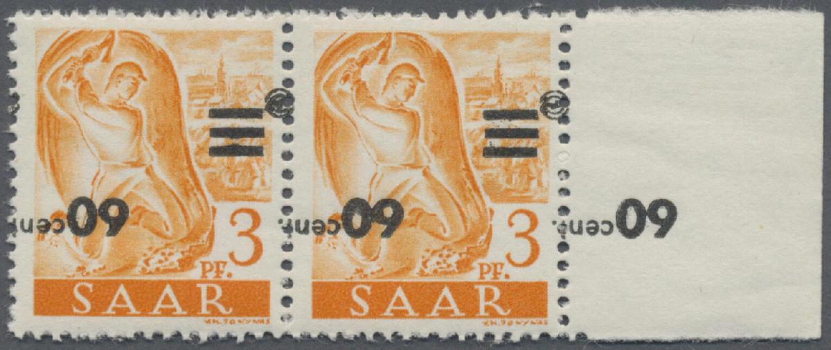 | Zusatzinformationen und Suchstichworte: | Christoph Gärtner 55. Auktion 20. - 24. Februar 2023 Los 6510 D Saarland 1947, Freimarke 60 cent auf 3 Pfg. mit kopfstehendem Aufdruck im waagerechten postfrischen Paar vom rechten (nicht linken!) Bogenrand, Aufdruck auch auf dem Bogenrand. Fotoattest Hoffmann BPP Ausruf 50,00 EUR |